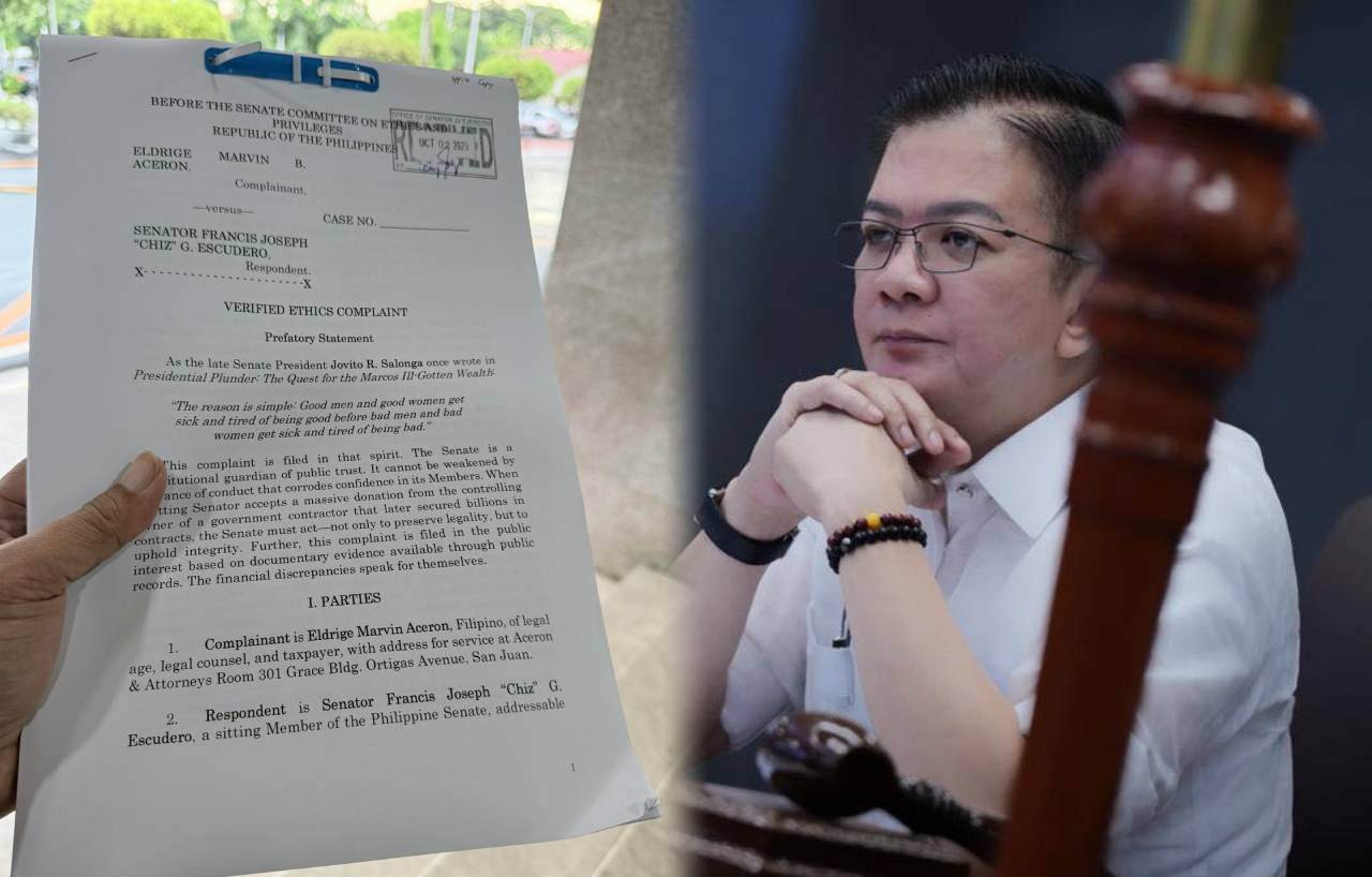 An ethics complaint was formally filed today against Senator Francis Joseph "Chiz" Escudero before the Senate Committee on Ethics and Privileges. The complaint focuses on a P30 million donation he received from Lawrence Lubiano, the majority owner of construction firm Centerways Construction and Development, Inc., and the substantial increase in government contracts subsequently awarded to Lubiano's companies.