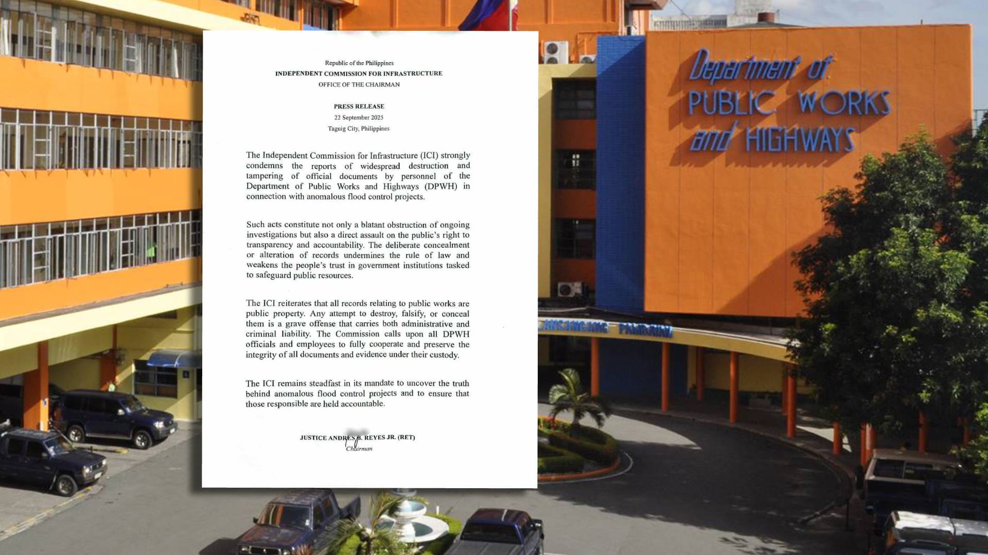 MANILA — The Independent Commission for Infrastructure (ICI) has strongly condemned reports that some Department of Public Works and Highways (DPWH) personnel allegedly destroyed documents related to the investigation of anomalous flood control projects.