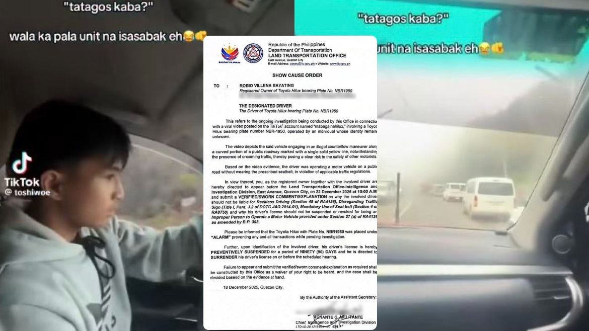 In a Show Cause Order issued by the LTO, both the registered owner of the vehicle and the still-unidentified driver were ordered to explain the violations committed. The driver faces multiple charges, including reckless driving, disregarding traffic signs, violation of the mandatory use of seatbelts, and operating a motor vehicle without proper qualifications.