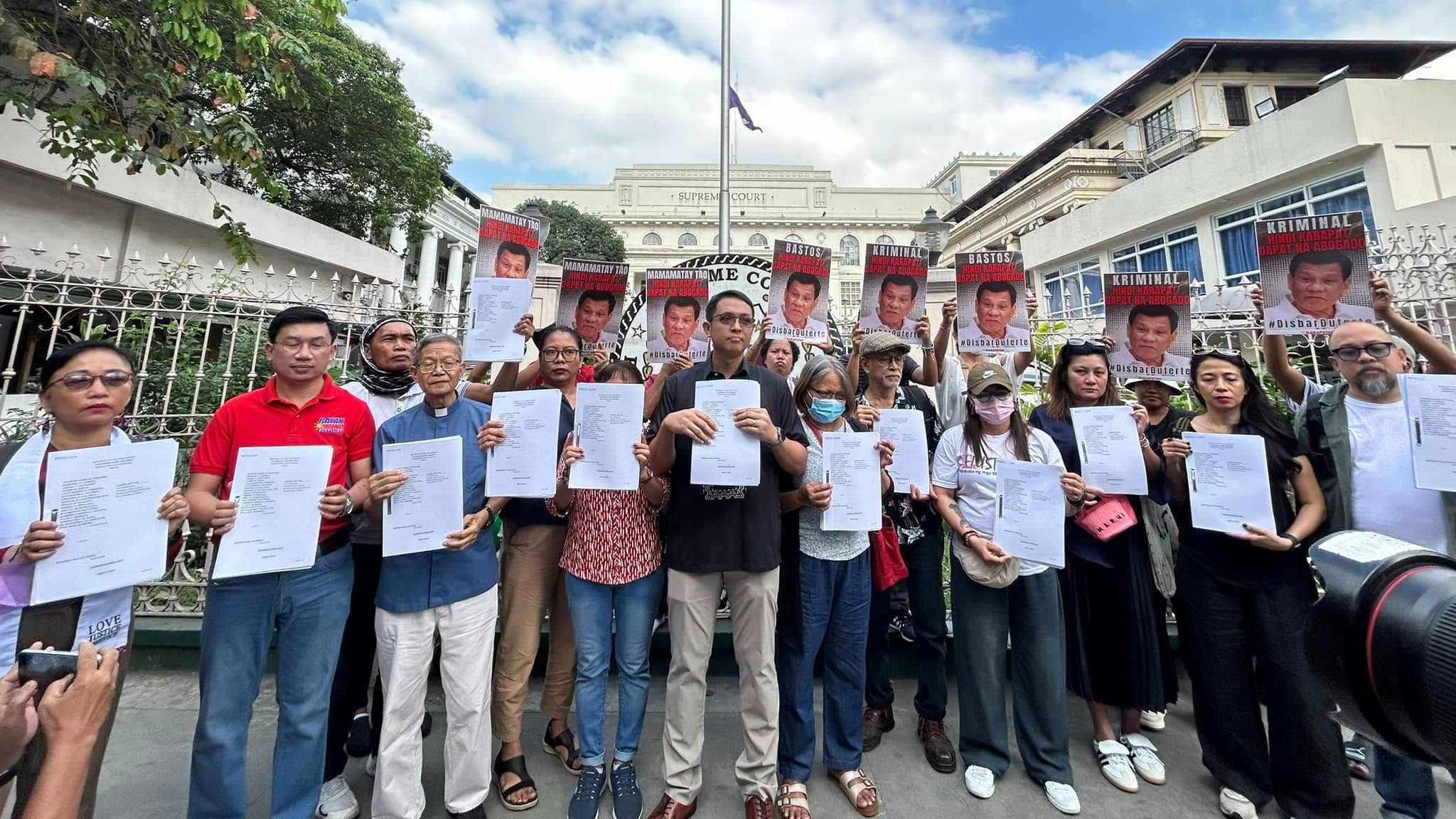Human rights alliance KARAPATAN as well as families of victims of extrajudicial killings (EJK) and human rights defenders have filed a disbarment complaint against former President Rodrigo Duterte. The complaint, submitted to the Supreme Court, alleges violations of the Code of Professional Responsibility and Accountability (CPRA) and conduct unbecoming of a lawyer.