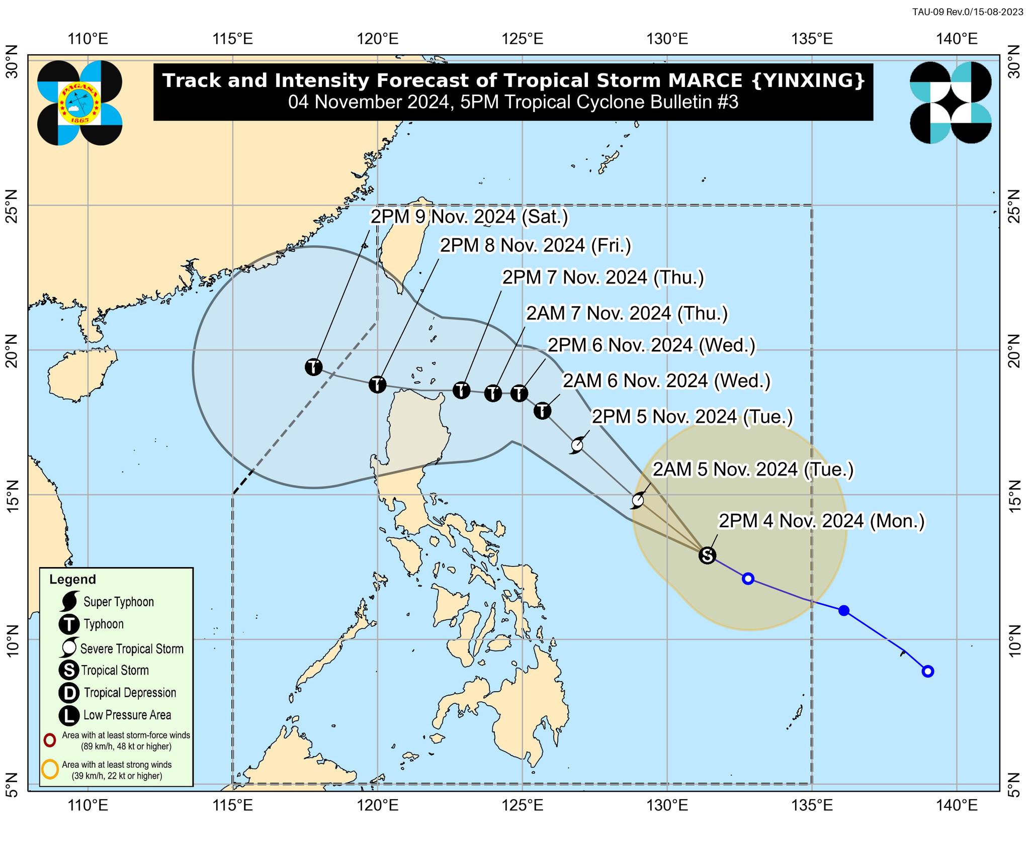 As of 5:00 PM today, PAGASA released its latest update on Tropical Storm Marce (Yinxing), which is currently picking up strength over the Philippine Sea and is expected to bring rains and potentially severe winds to Northern Luzon over the coming days.