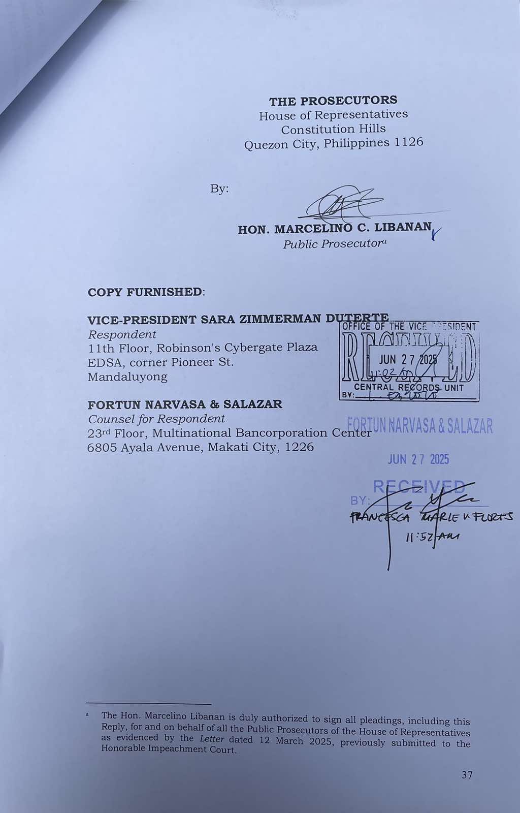 Filed on Friday, the prosecution’s Reply challenges Duterte’s Answer ad cautelam—a preliminary defense she submitted in hopes of halting the impeachment process. The Reply, signed by House Minority Leader and lead prosecutor Marcelino C. Libanan, argues that her response is “full of falsehoods, misleading claims, and baseless procedural objections.”