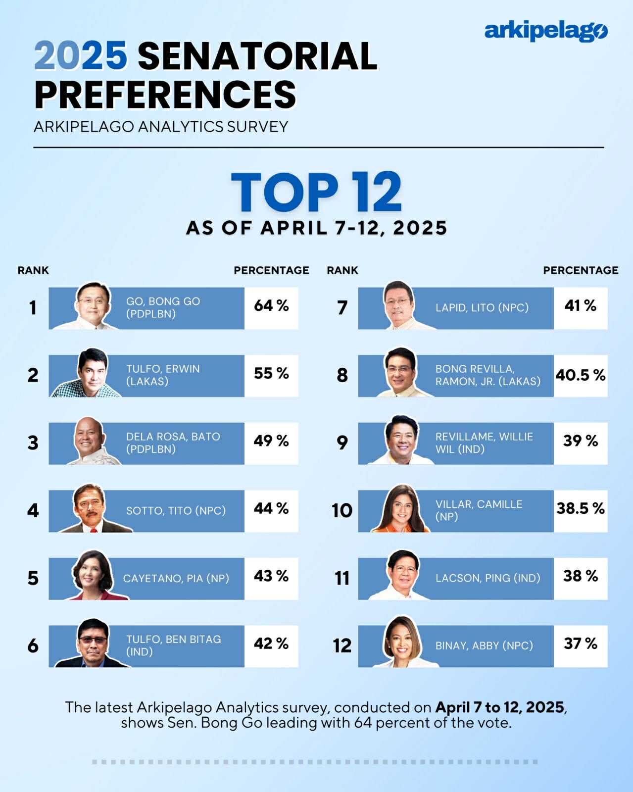 According to the latest poll by Arkipelago Analytics, Bong Go is leading the pack with a solid 64% voter preference—yup, more than half of surveyed Filipinos are backing him.