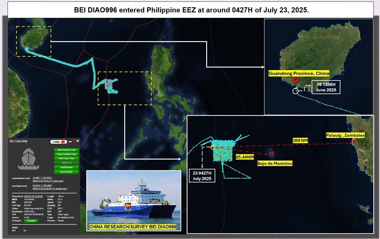 The first vessel, BEI DIAO 996, departed Guangdong Province on June 16, 2025, and entered the Philippine EEZ roughly a week later. Currently stationed approximately 185 nautical miles off the coast of Zambales, the vessel has been observed carrying out MSR activities about 40 nautical miles west of Bajo de Masinloc. Although classified as a civilian research ship, BEI DIAO 996 has dual-use capabilities, including underwater acoustic sensor testing and sonar equipment deployment. Notably, it holds the title of China’s largest deep-sea test ship and is recognized as the world’s largest Small Waterplane Area Twin Hull (SWATH) catamaran, engineered for optimal stability even in challenging sea conditions.