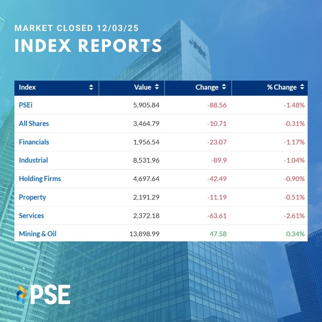 The Philippine Stock Exchange Index (PSEi) struggled on Wednesday, December 3, 2025, closing sharply lower at 5,905.84, down 88.56 points or 1.48% as broad-based selling weighed on the market.