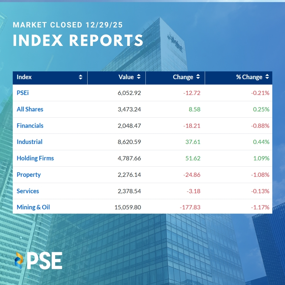 The Philippine Stock Exchange index (PSEi) ended the trading session on December 29, 2025 slightly lower, slipping 12.72 points or 0.21 percent to close at 6,052.92, as investor sentiment softened toward the end of the year.