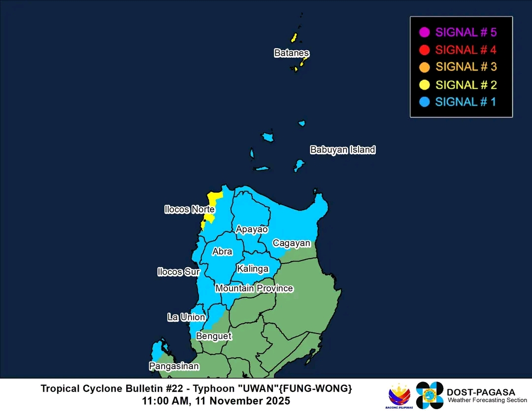 According to PAGASA’s latest bulletin, Uwan’s center was last spotted 370 kilometers west-northwest of Calayan, Cagayan, packing maximum sustained winds of 110 km/h and gusts reaching up to 135 km/h. It’s now moving north-northwest at 10 km/h and is expected to continue drifting away from the country.