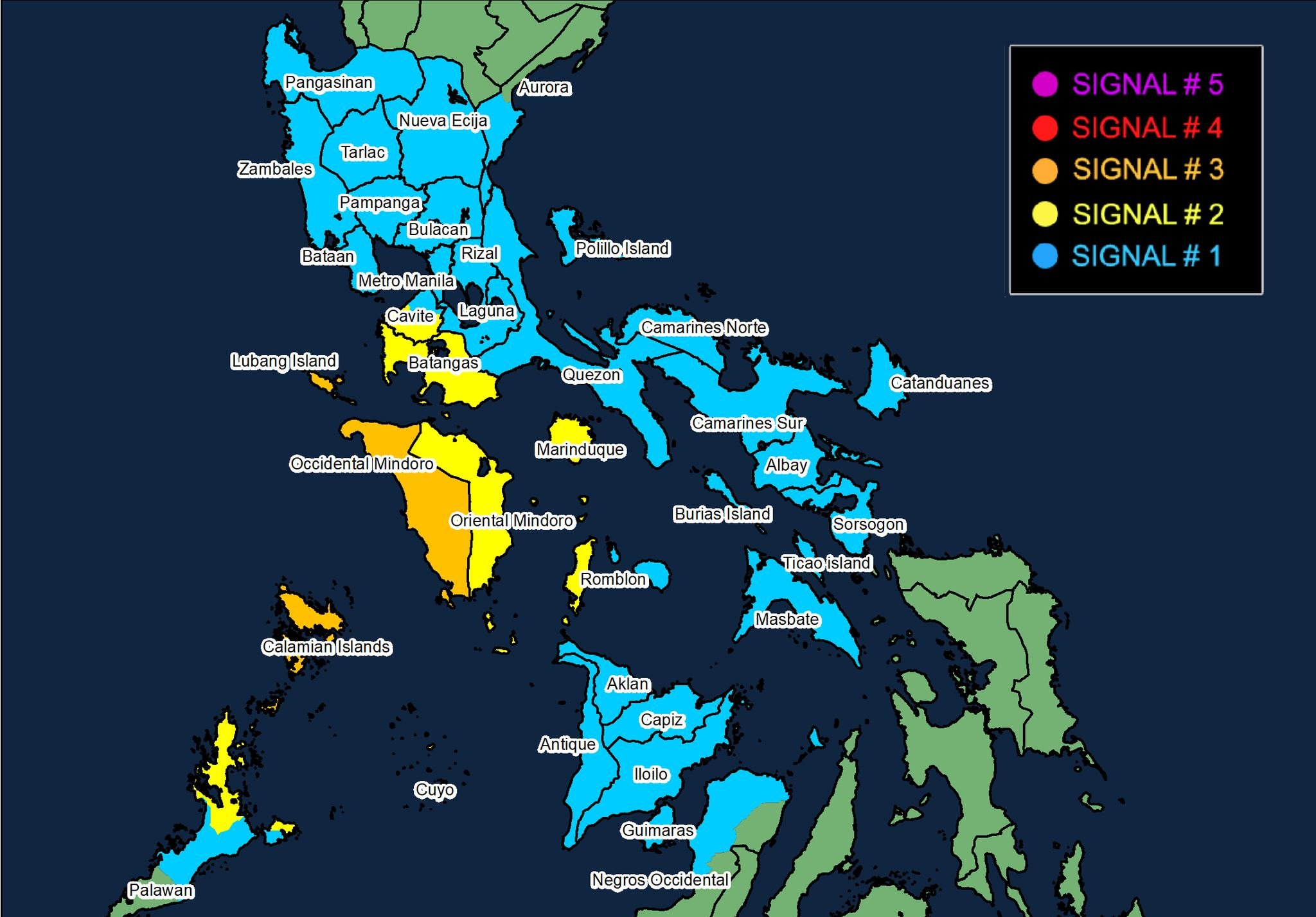 • Signal No. 1 (strong winds, 39–61 km/h): Metro Manila, Pangasinan, Zambales, Bataan, Pampanga, Bulacan, Rizal, Laguna, Quezon, Bicol Region, northern Palawan, parts of Visayas, and several other provinces.