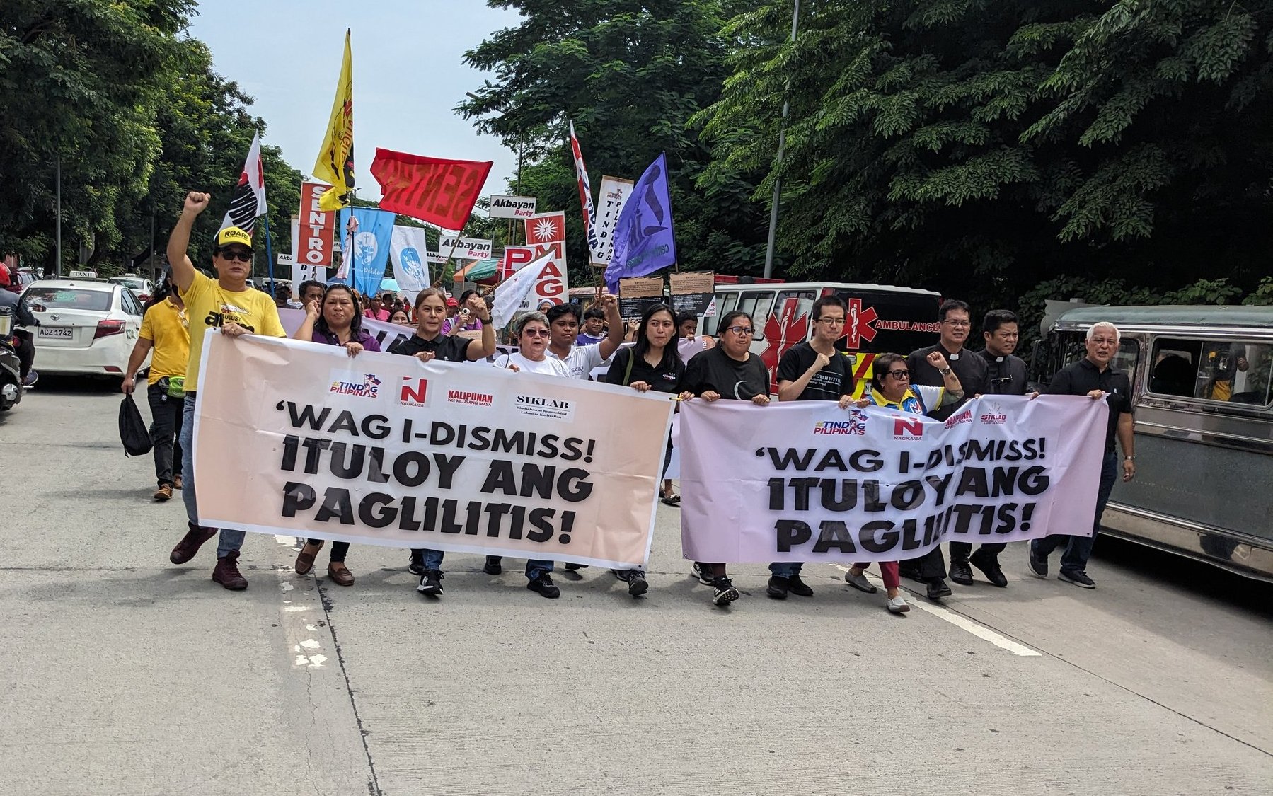 “Ituloy ang paglilitis!” was the resounding message delivered during a protest action staged near the Senate gates, where Tañada joined civil society groups urging senators to wait for the Supreme Court’s ruling on the House of Representatives’ motion for reconsideration before making any move to dismiss the case.