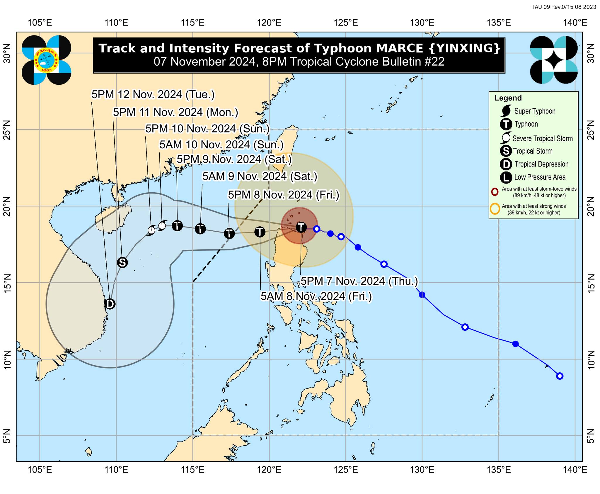 Typhoon Marce will likely continue its westward path and exit the Philippine Area of Responsibility (PAR) tomorrow. However, it may still strengthen to a super typhoon briefly before possibly weakening as it crosses the mountains of Northern Luzon and encounters drier air. For now, the typhoon remains a serious threat to affected areas, and residents are advised to stay indoors and follow local government advisories closely.