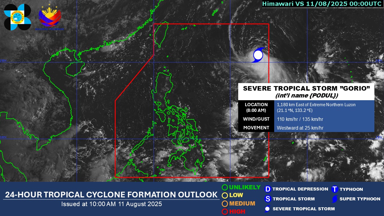 As of 8:00 AM today, August 11, 2025, “GORIO” is located approximately 1,305 kilometers east of Extreme Northern Luzon (21.1°N, 134.4°E). The storm packs maximum sustained winds of 110 km/h near its center, with gusts reaching up to 135 km/h. It is moving westward at a speed of 25 km/h.