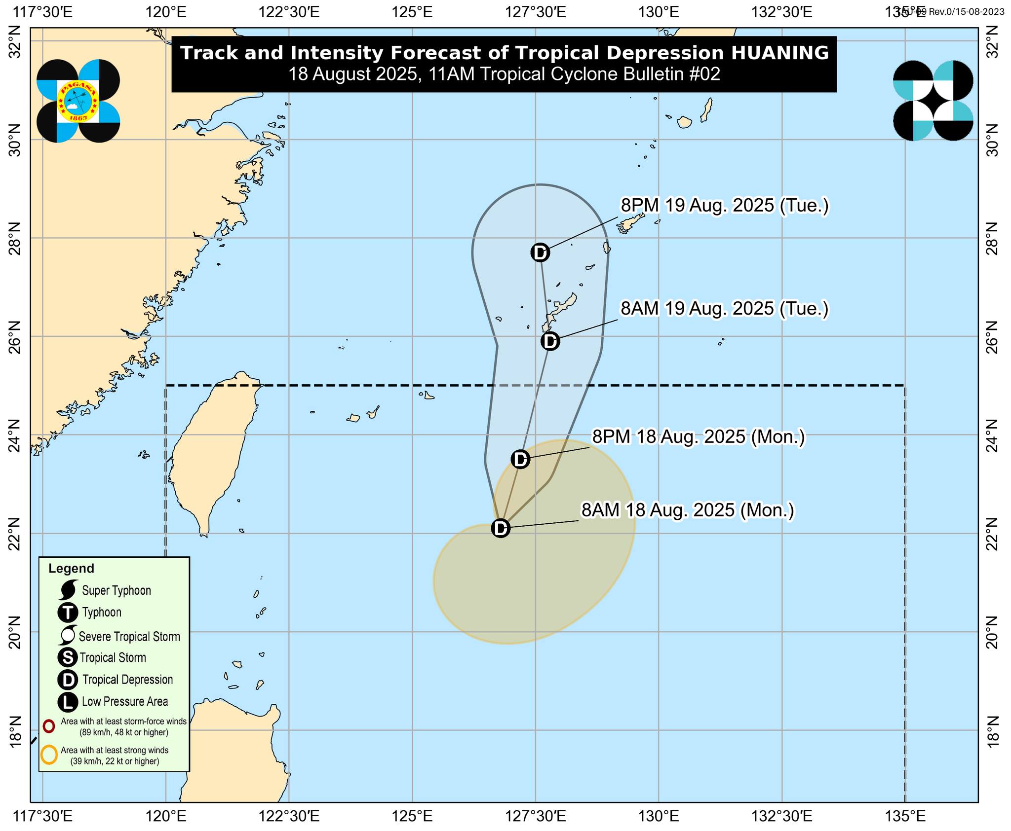 The tropical depression is forecast to move generally northward and leave the Philippine Area of Responsibility (PAR) either tonight or by tomorrow morning, August 19. On its projected path, Huaning may pass close to or over the Okinawa Islands by tomorrow morning or afternoon. While intensification into a tropical storm cannot be completely ruled out, PAGASA said the system will most likely remain a tropical depression until it exits PAR.