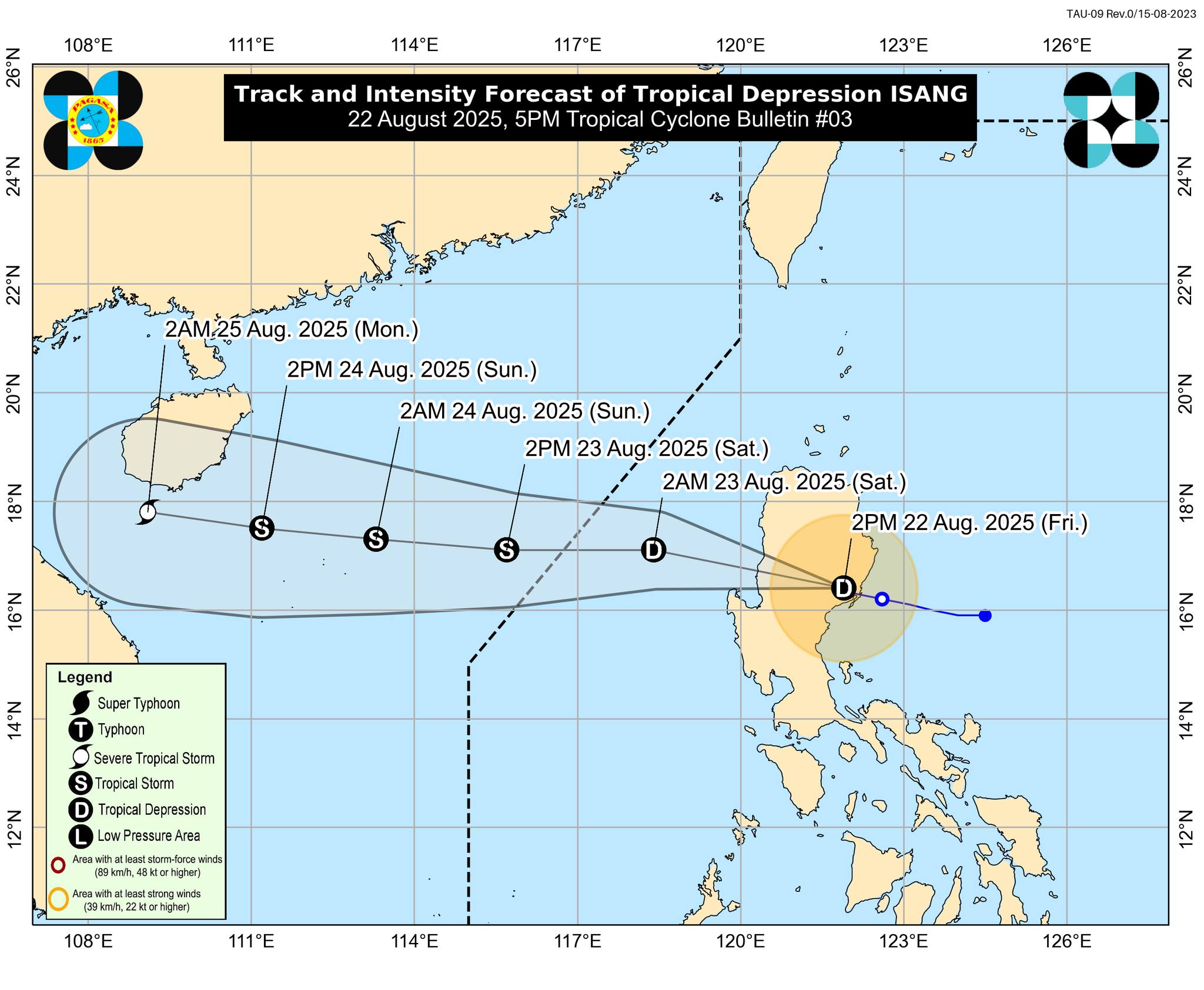 Tropical Depression Isang has slightly decelerated while continuing its passage across Quirino Province, according to the latest tropical cyclone bulletin issued by PAGASA at 5:00 PM on August 22, 2025.