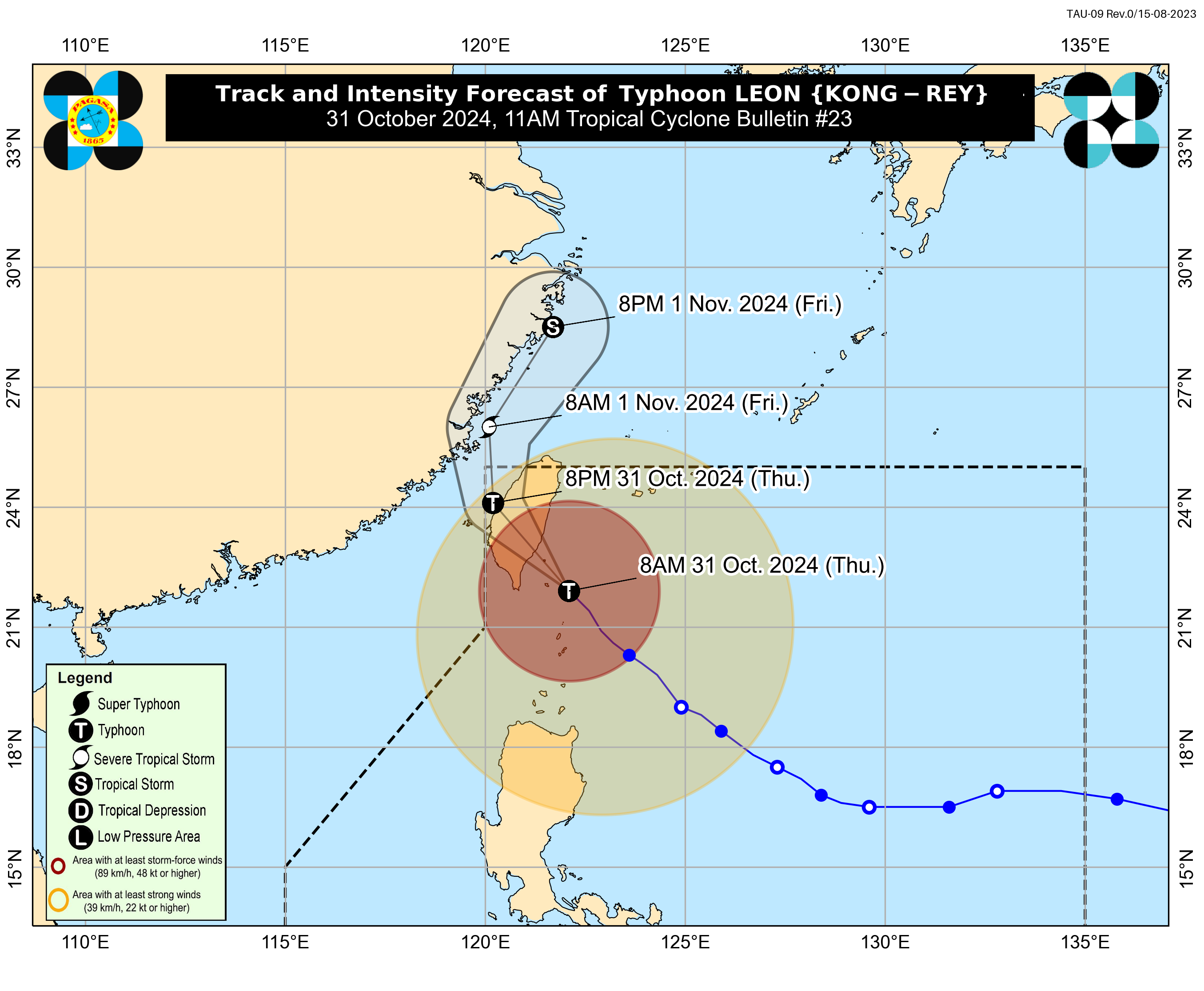 Leon is moving northwestward at around 25 km/h and will likely make landfall along Taiwan’s eastern coast later today. After crossing Taiwan, the storm is expected to head northeastward over the Taiwan Strait and exit the Philippine Area of Responsibility either late tonight or early tomorrow morning, November 1st.