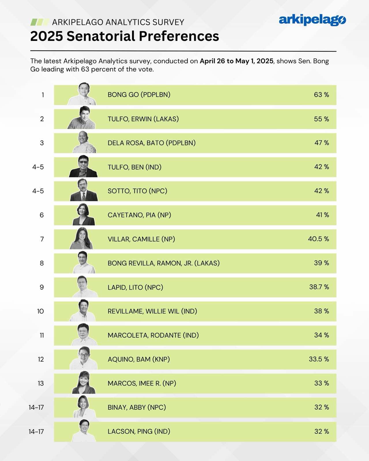 According to the latest Arkipelago Analytics survey, Bong Go continues to enjoy strong support from Filipino voters, pulling in a solid 63%. That keeps him at the top of the heap, but he’s not exactly coasting to the finish line — hot on his heels are broadcaster Erwin Tulfo with 55%, and former police chief Ronald “Bato” Dela Rosa at 47%.
