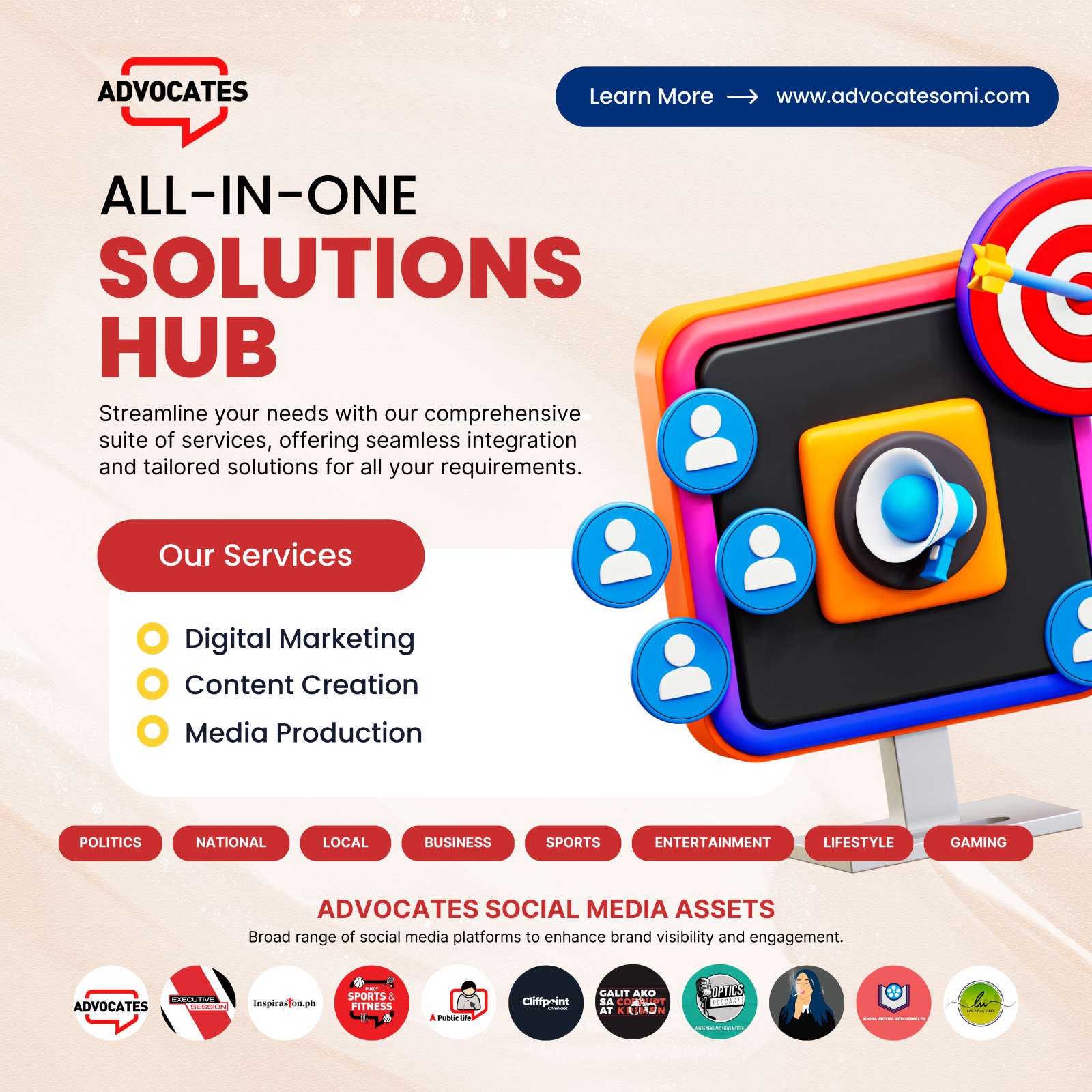 At Advocates Philippines, we understand that in today's fast-paced world, businesses need more than just a service provider—they need a partner that delivers seamless, all-in-one solutions tailored to their unique needs. That's why we’ve designed a comprehensive suite of services that make us your ultimate solutions hub. From digital marketing to content creation and media production, we’ve got you covered!