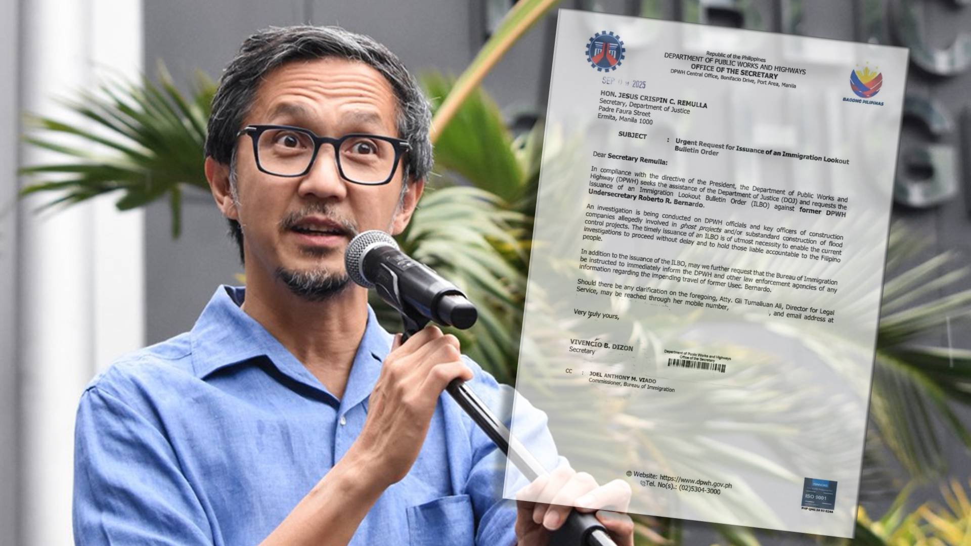 Department of Public Works and Highways (DPWH) Secretary Vince Dizon has officially requested that the Department of Justice (DOJ) issue an Immigration Lookout Bulletin Order (ILBO) for former DPWH Undersecretary Roberto R. Bernardo. The action aims to prevent Bernardo from leaving the country while an investigation into alleged ghost and substandard flood control projects is ongoing.
