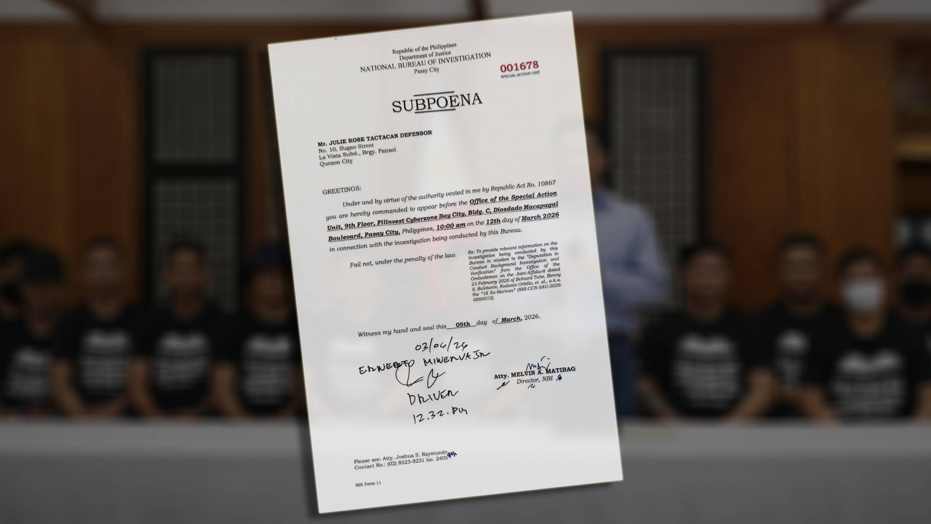 NBI Director Melvin Matibag confirmed that subpoenas were issued to several individuals connected to the press conference, including Defensor, Baligod, and the individuals who claimed to be former Marines.