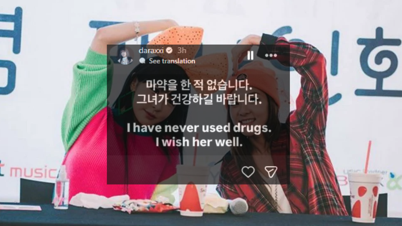 In a brief Instagram Story that quickly spread among fans in South Korea and the Philippines, Sandara wrote: “I have never used drugs. I wish her well.” The post did not mention anyone by name, but the timing left little doubt about whom it was addressing.