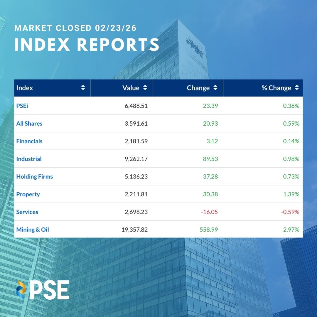 MANILA, Philippines — The local stock market started the week on a strong note, with the Philippine Stock Exchange Index (PSEi) closing at 6,530.38 as of 1:51 p.m. on February 23, 2026, up 65.26 points or 1.01 percent.