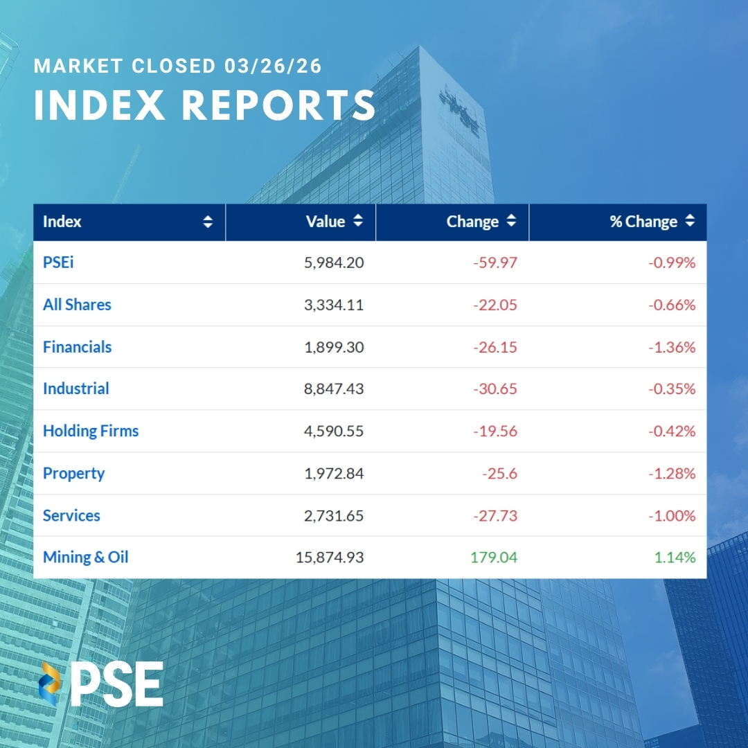 The Philippine Stock Exchange index (PSEi) slipped on March 26, 2026, closing at 5,984.20, down 59.97 points or 0.99%, as investors weighed market uncertainties and profit-taking.
