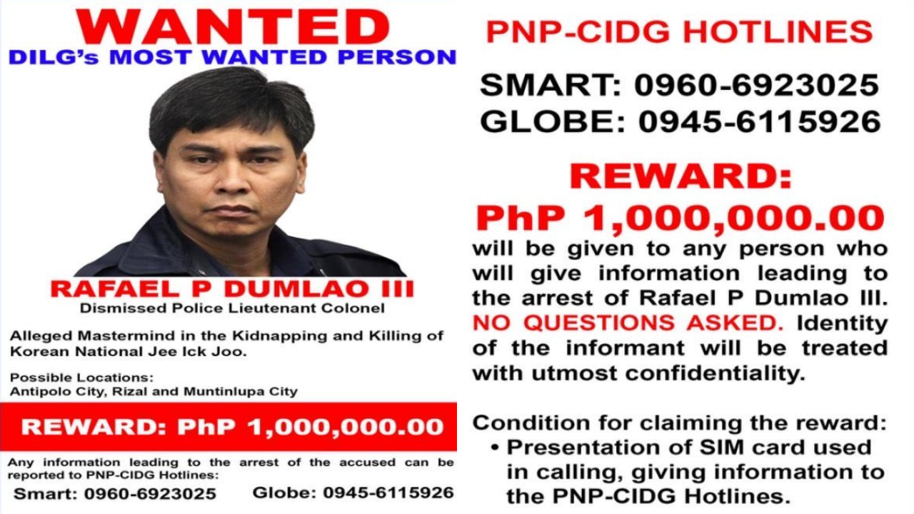 The Criminal Investigation and Detection Group (CIDG) has launched a 24/7 nationwide manhunt for dismissed police official Rafael P. Dumlao III, identified as the alleged mastermind behind the 2016 kidnapping and killing of Korean national Jee Ick Joo.