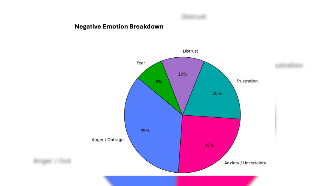Emotions online are intense. Anger and outrage top the charts at 35%, often expressed with sharp criticism and even profanity. Anxiety and uncertainty follow at 25%, frustration at 20%, and distrust and fear at 12% and 8%, showing deeper worries about economic stability.
