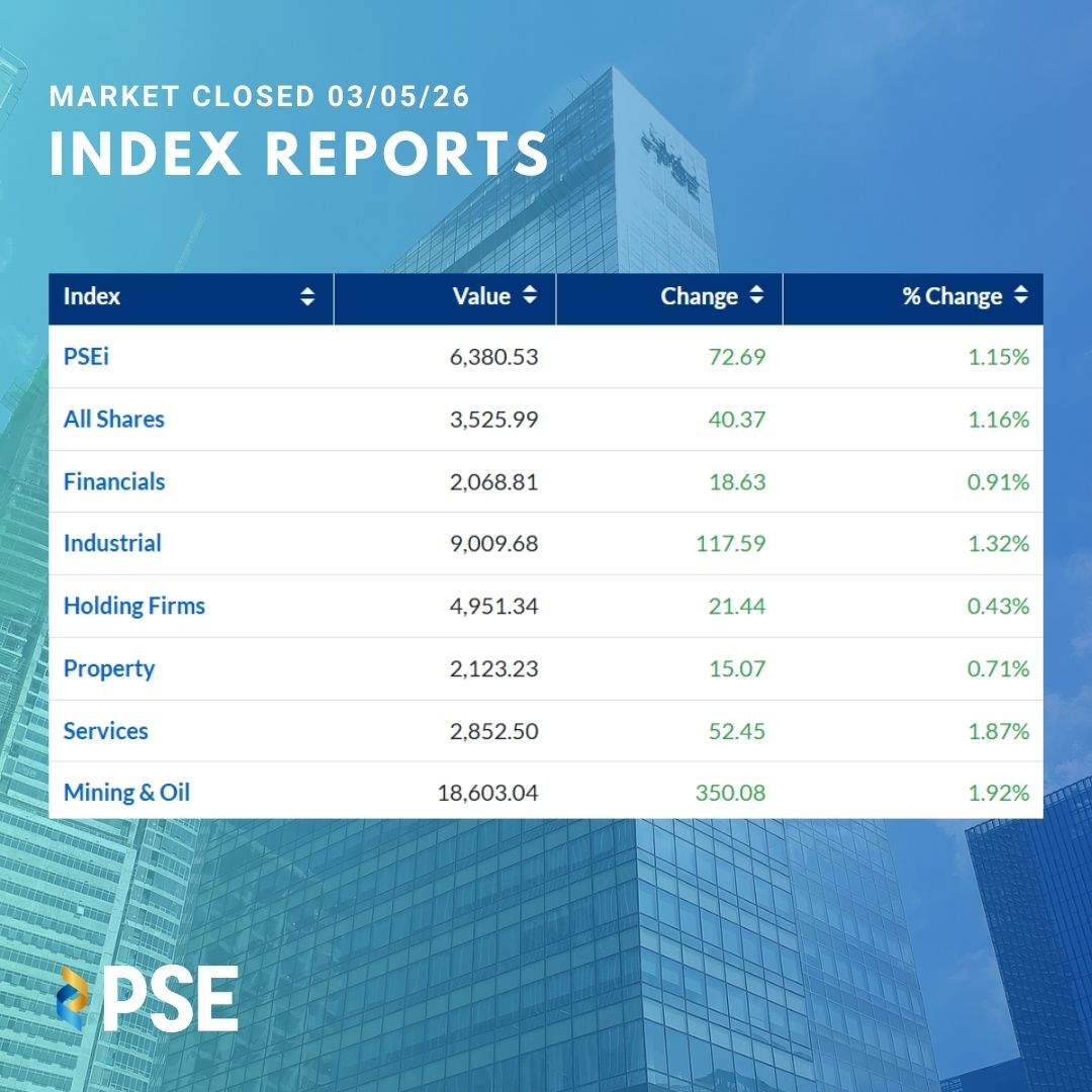 March 5, 2026 – The Philippine Stock Exchange Index (PSEi) made a solid comeback today, climbing 72.69 points, or 1.15%, to close at 6,380.53. Investors seemed encouraged by the day’s positive momentum, with more stocks advancing than declining.