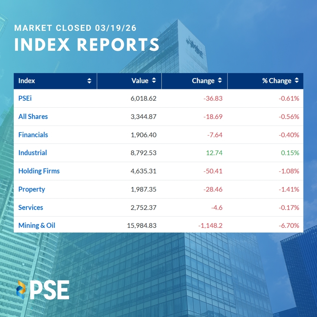 The Philippine Stock Exchange index (PSEi) closed at 6,018.62 on March 19, down 36.83 points or 0.61%.