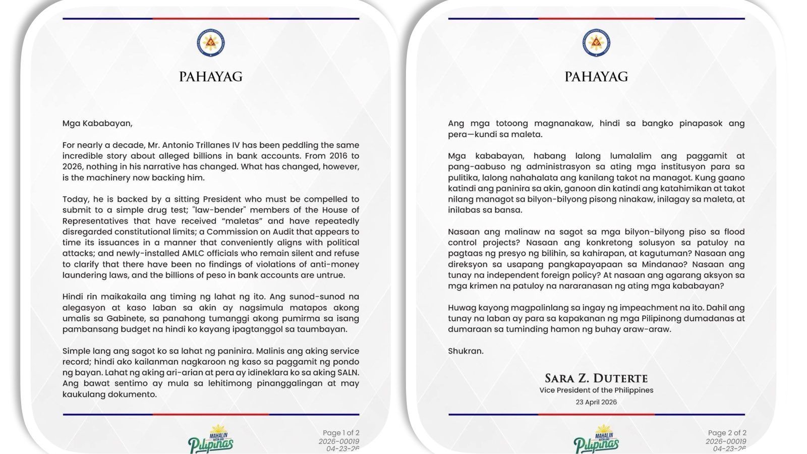 In a strongly worded statement released Thursday, Duterte called out Antonio Trillanes IV for repeatedly raising what she described as an “incredible story” about alleged billions in bank accounts, saying the narrative has remained unchanged for nearly a decade.