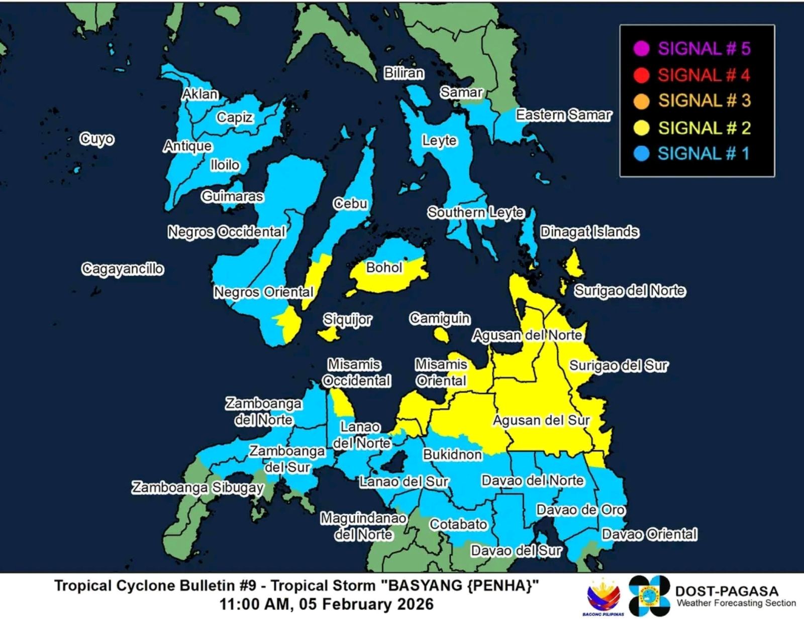 Looking ahead, PAGASA said Basyang is expected to make its first landfall over Surigao del Sur later tonight. After crossing Mindanao, it may emerge over the Bohol Sea by Friday morning and could pass near or make another landfall over Siquijor and southern Negros Oriental by Friday afternoon. The storm is then forecast to move toward the Sulu Sea and cross northern Palawan over the weekend.