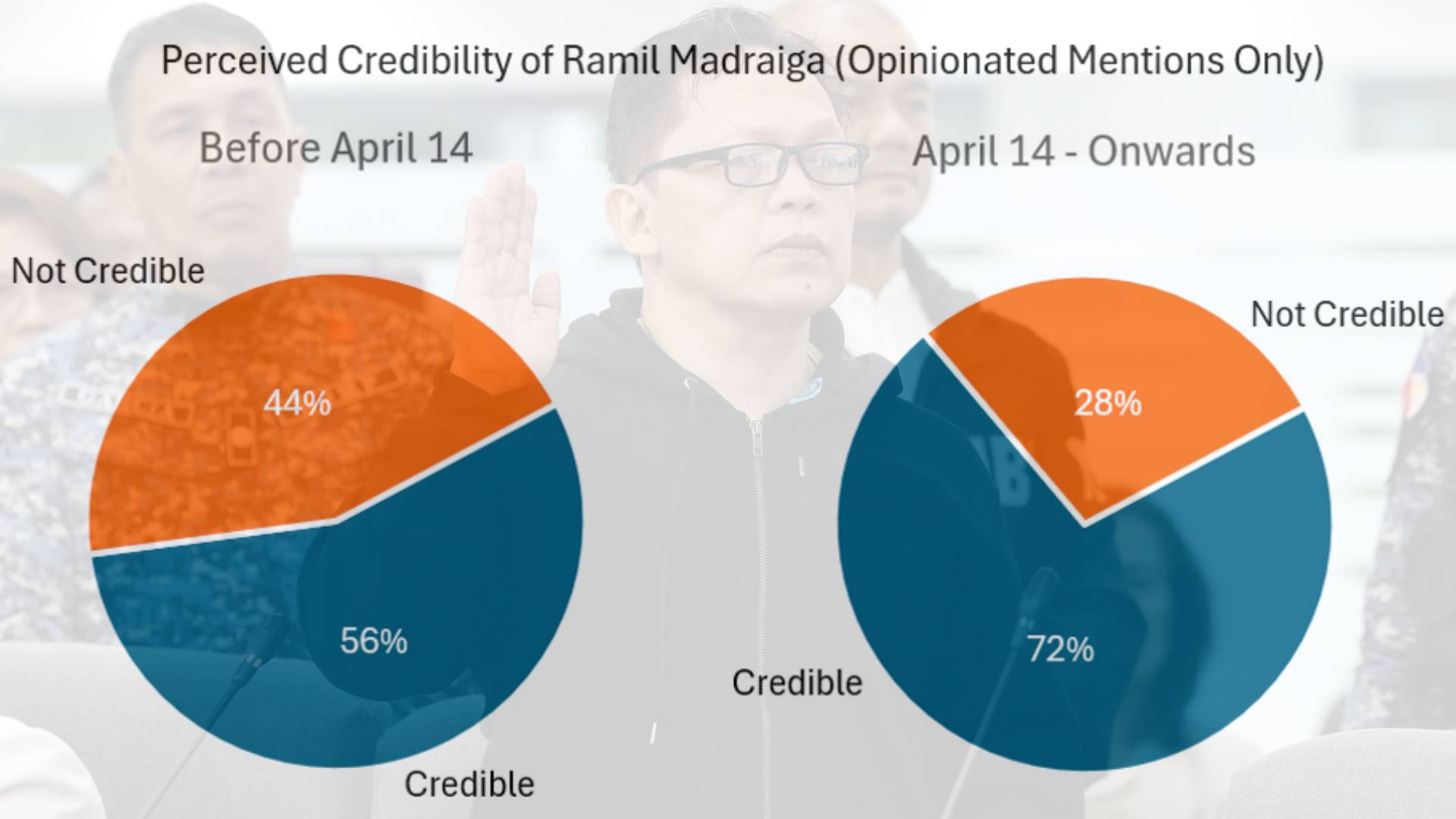 Public perception of Ramil Madriaga shifted significantly after April 14, with more people viewing him as a credible witness, according to a social listening report by Insightspedia.