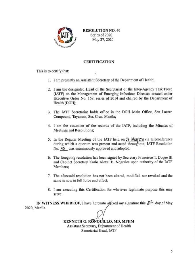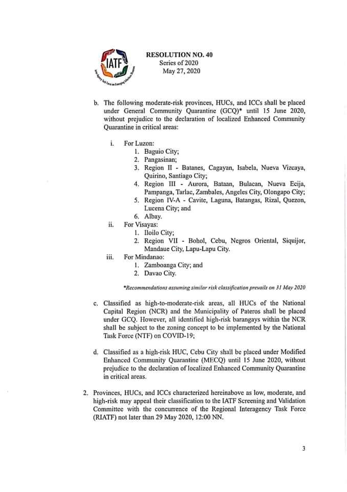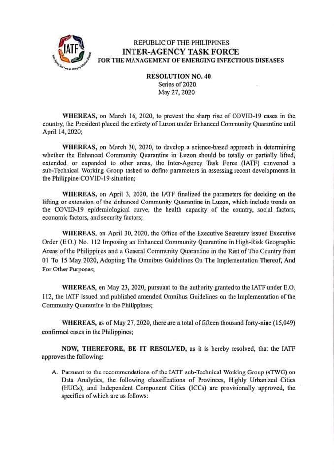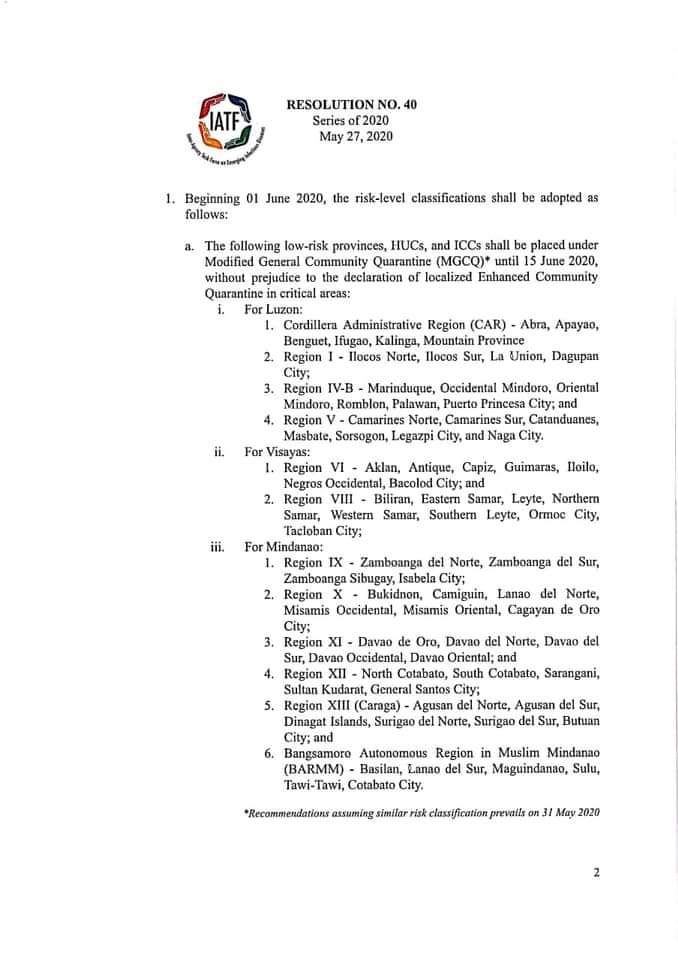 Resolution 40 of the Inter-agency Task Force for the Management of Emerging Infectious Diseases (IATF) put Albay under General Community Quarantine (GCQ) status, while the other provinces were to be put under MGCQ.
