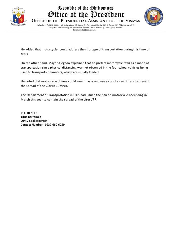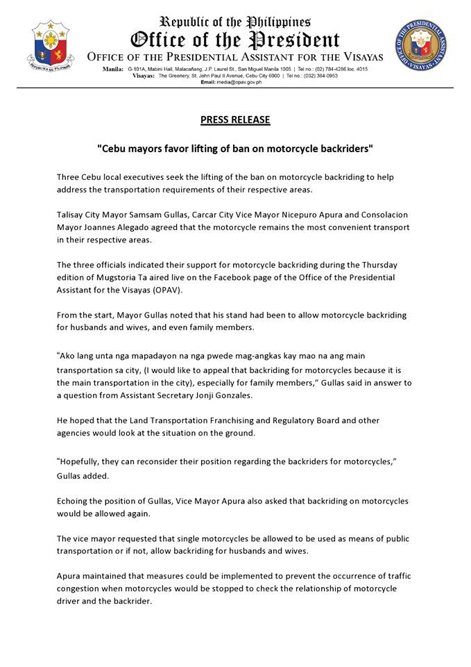 “Ako lang unta nga mapadayon na nga pwede mag-angkas kay mao na ang main transportation sa city, (I would like to appeal for backriding on motorcycles because it is the main transportation in the city), especially for family members,” said Gullas said in an interview with Office of the Presidential Assistant for the Visayas (OPAV) .