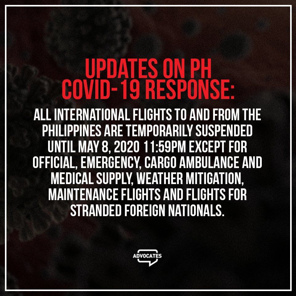 The IATF approves the temporary suspension of all international flights to and from the Philippines until May 8, Presidential Spokesperson Harry Roque announced in a press briefing on Tuesday.