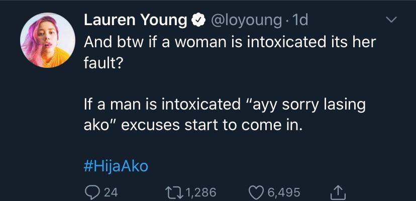 Young also gave a mouthful about the double standard involving men and women: “And btw if a women is intoxicated it’s her fault? If a man is intoxicated ‘ayy sorry lasing ako’ excuses start to come in. #HijaAko,” she tweeted.
