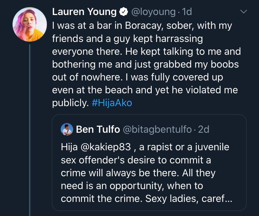 “I was at a bar in Boracay, sober, with my friends and a guy kept harassing everyone there. He kept talking to me and bothering me and just grabbed my boobs out of nowhere. I was fully covered up even at the beach and yet he violated me publicly. #HijaAko,” she tweeted in response to Ben Tulfo’s saying that a ‘rapists’ desire to commit a crime will always be there,” and all they need is an opportunity to do it, so women should be careful with the way they dress.