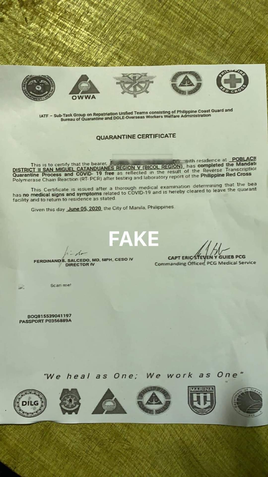 Returned OFW in Catanduanes may be charged for presenting fake quarantine certificate