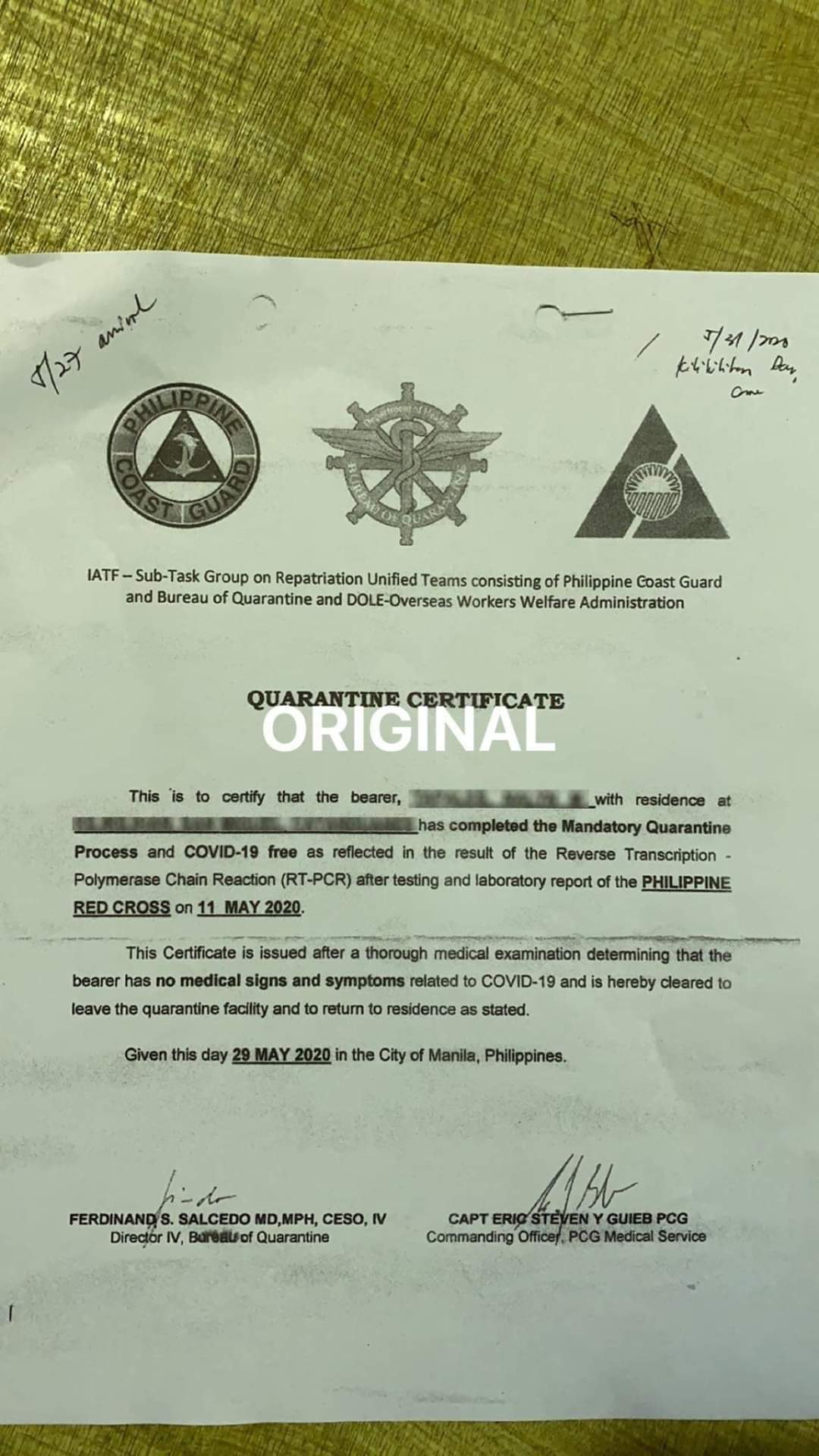 The OFW arrived in the Philippines on May 23 and was quarantined in a Makati hotel. He was transported to Tabaco City in Albay on June 6 where he presented the said quarantine certificate dated June 5. He stayed in Tabaco until he arrived at a quarantine facility in Catanduanes on June 8.